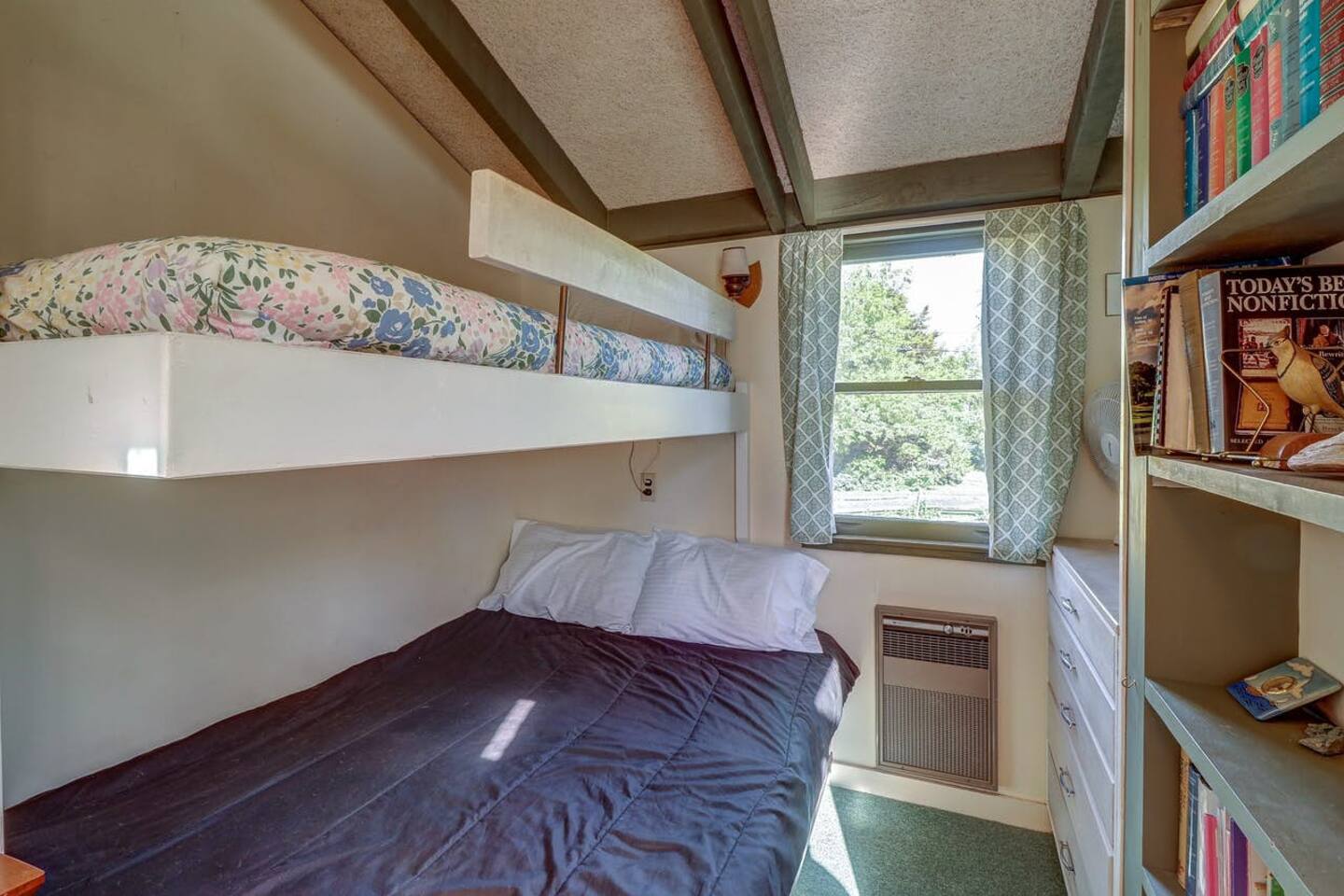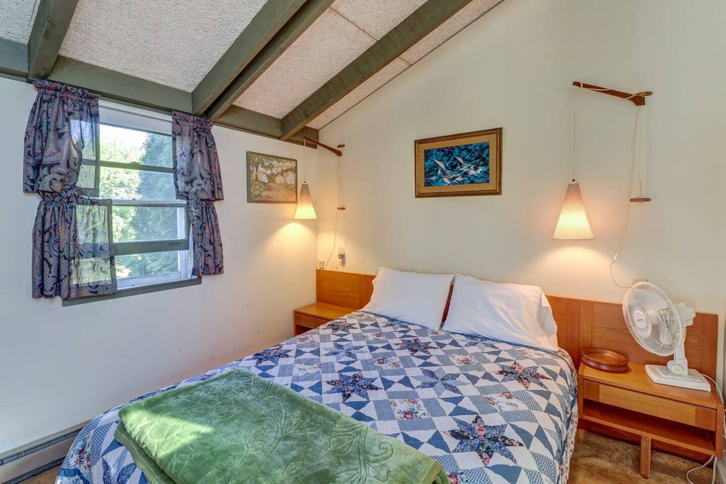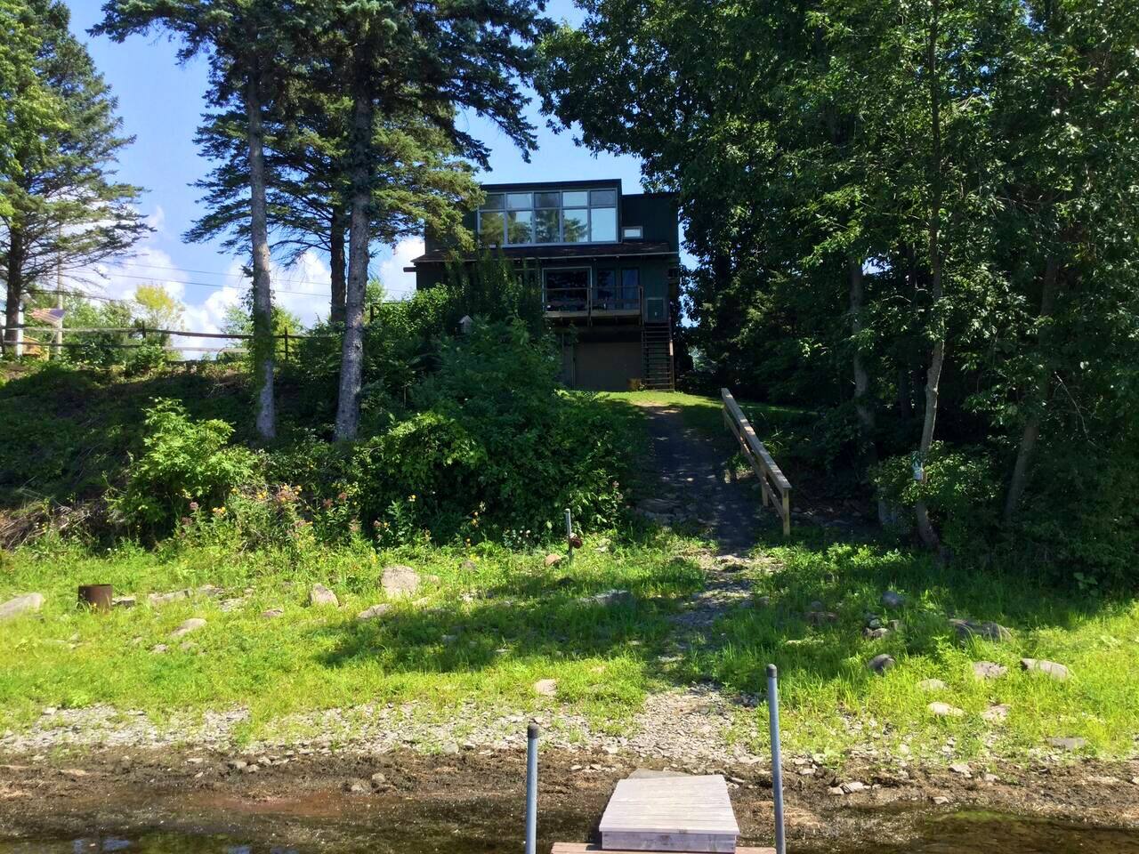 This authentic Vermont lakeside camp is a rustic home with a warm interior featuring exposed wooden beams, custom furnishings, and large picture windows. Single, large ac unit cools the whole house! Awesome views of the lake, great family gathering areas in the house and out on the large deck with BBQ grill. Direct lake frontage with dock makes this a great spot for fishermen and families alike. Large front lawn, great for games with your dog, or just hanging out.