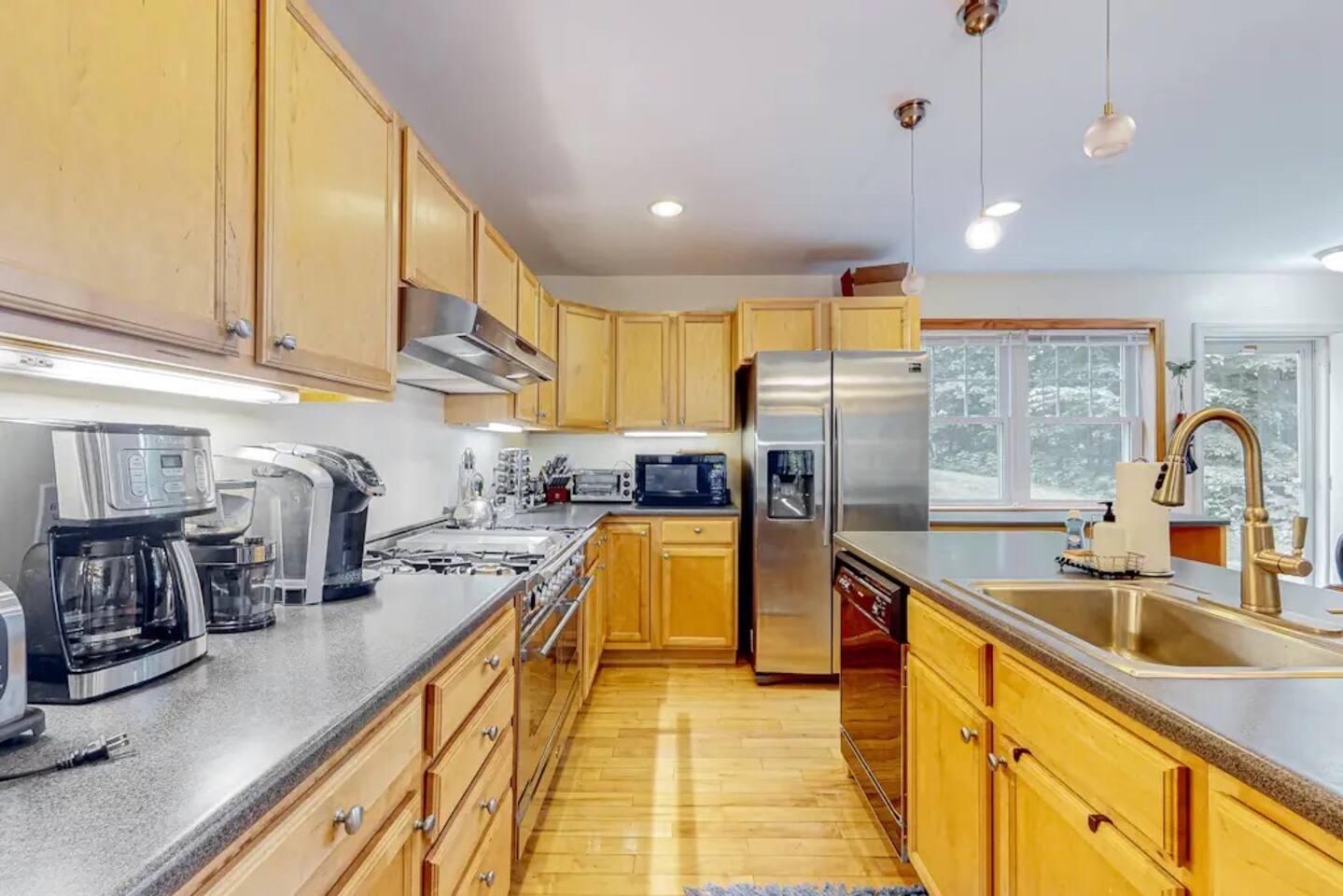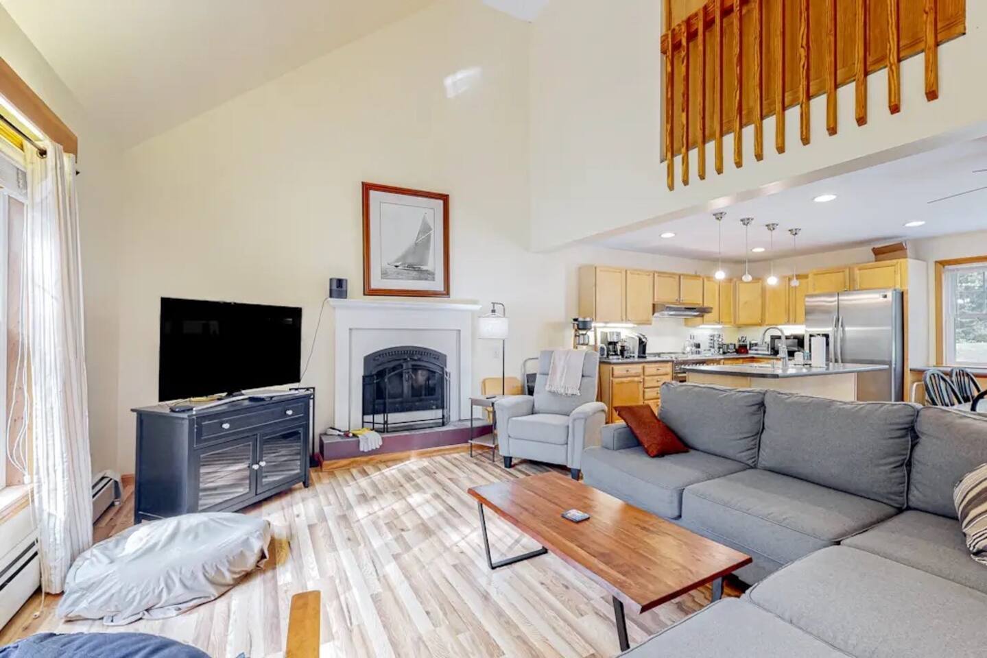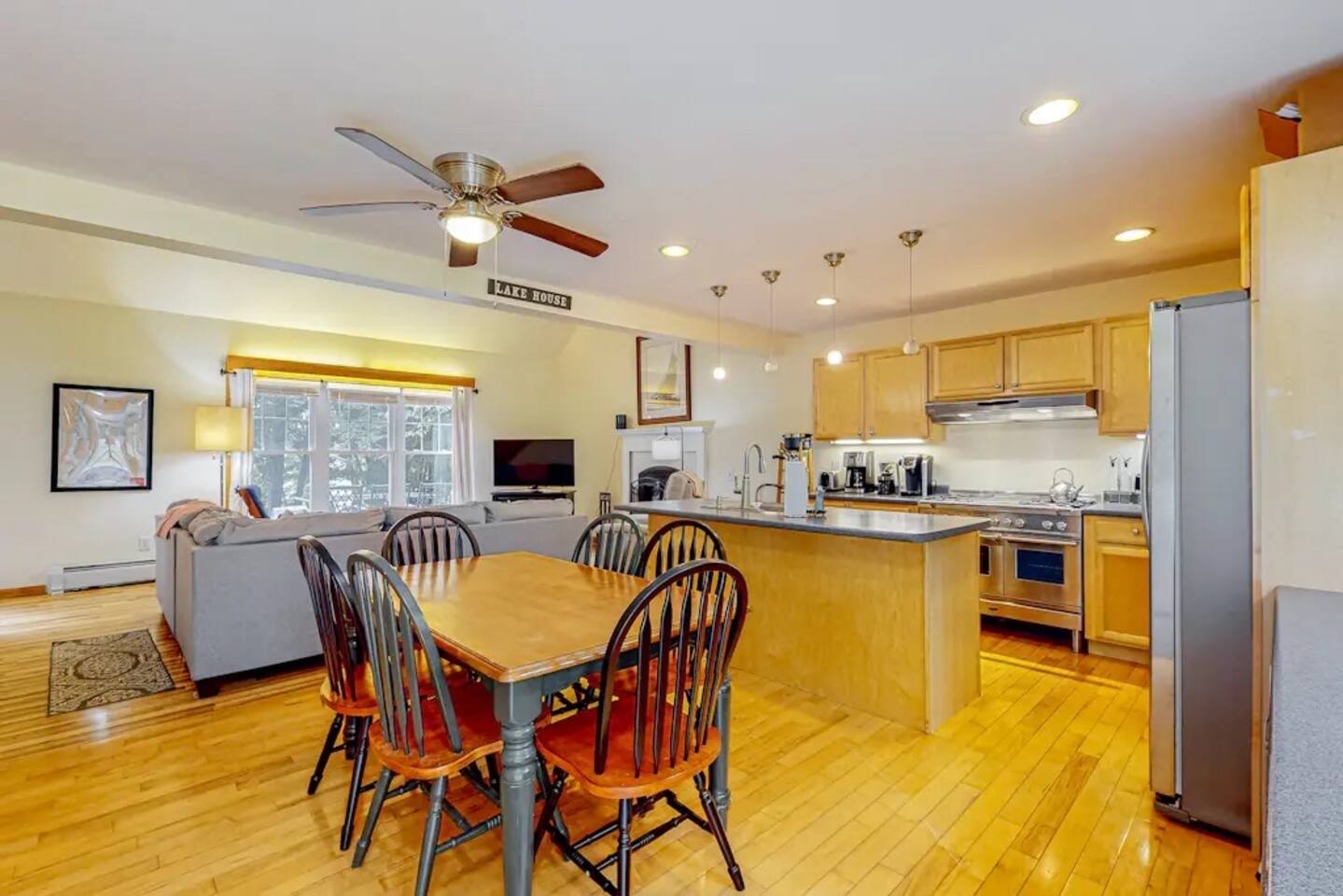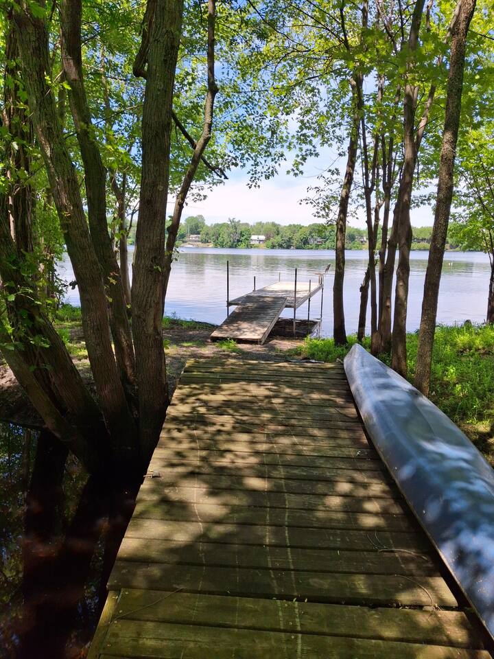 A gorgeous lakefront property offering 3 bedrooms, 2 bathrooms, gourmet kitchen, living room with wood stove fireplace, deck, dock , kayaks, ping pong downstairs!