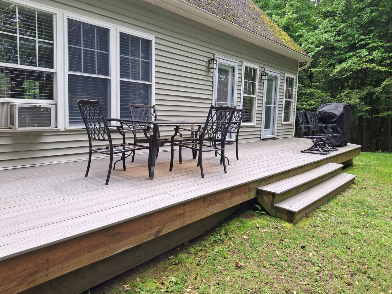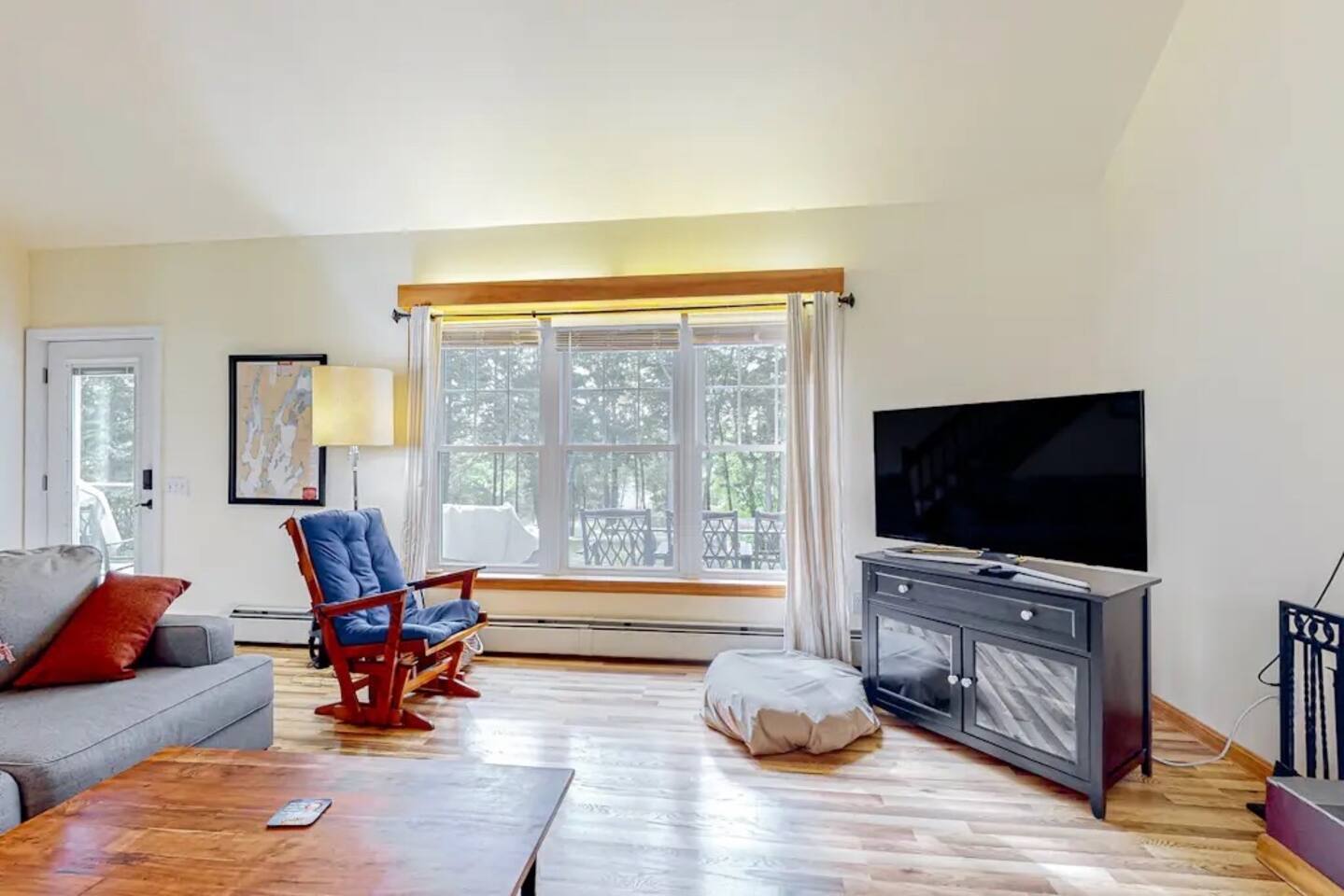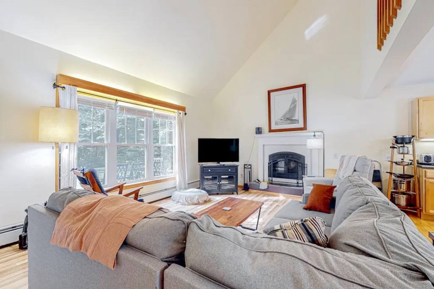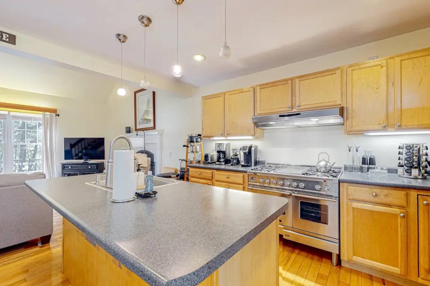 A gorgeous lakefront property offering 3 bedrooms, 2 bathrooms, gourmet kitchen, living room with wood stove fireplace, deck, dock , kayaks, ping pong downstairs!