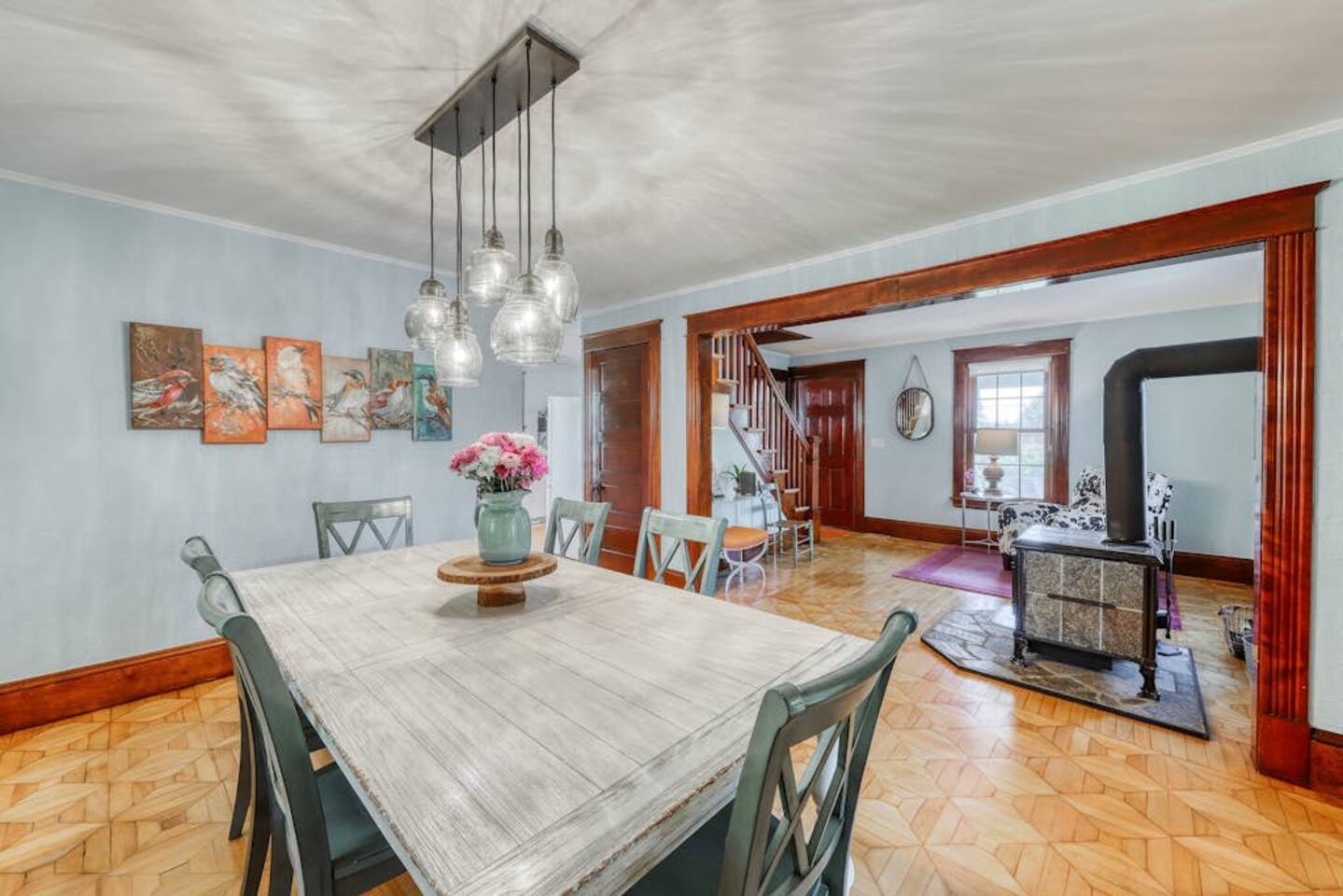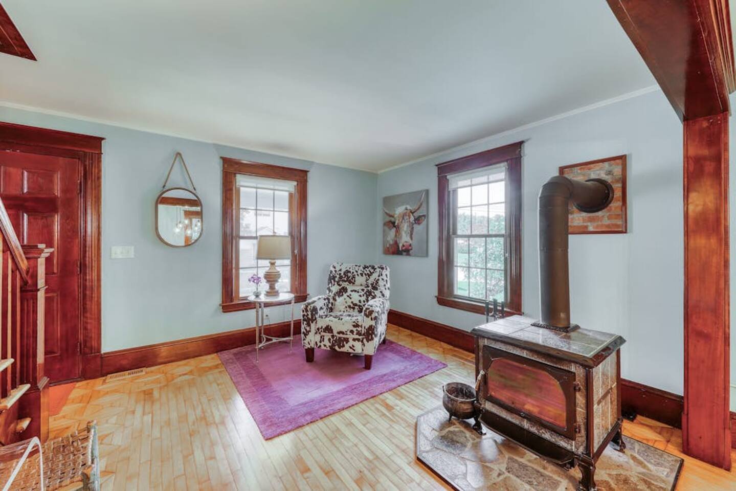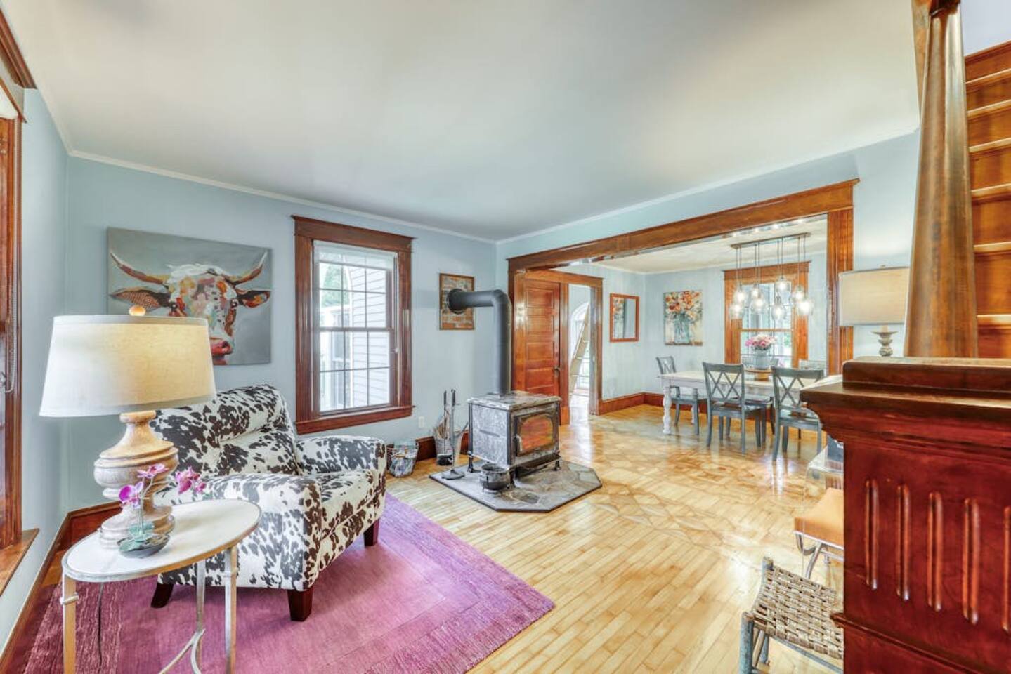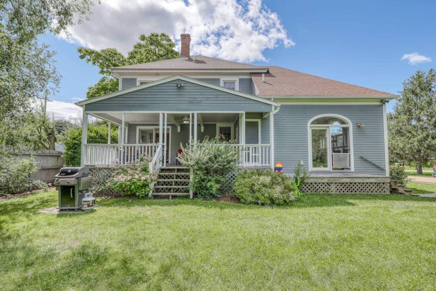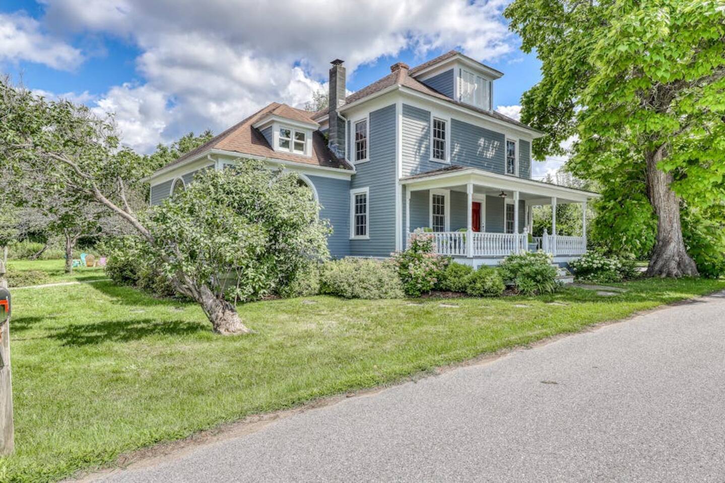 Get a beautiful glimpse of Vermont country living at this three-bedroom South Hero farmhouse, a classic and updated home with a spacious yard, a porch and back deck, and a gorgeous location in the heart of the Lake Champlain Islands. The living space is full of timeless character and features richly hued wood trim, patterned hardwood floors, and a wood-burning stove. Move into the great room to relax on the sectional sofa, play a board game at the table with family and friends!