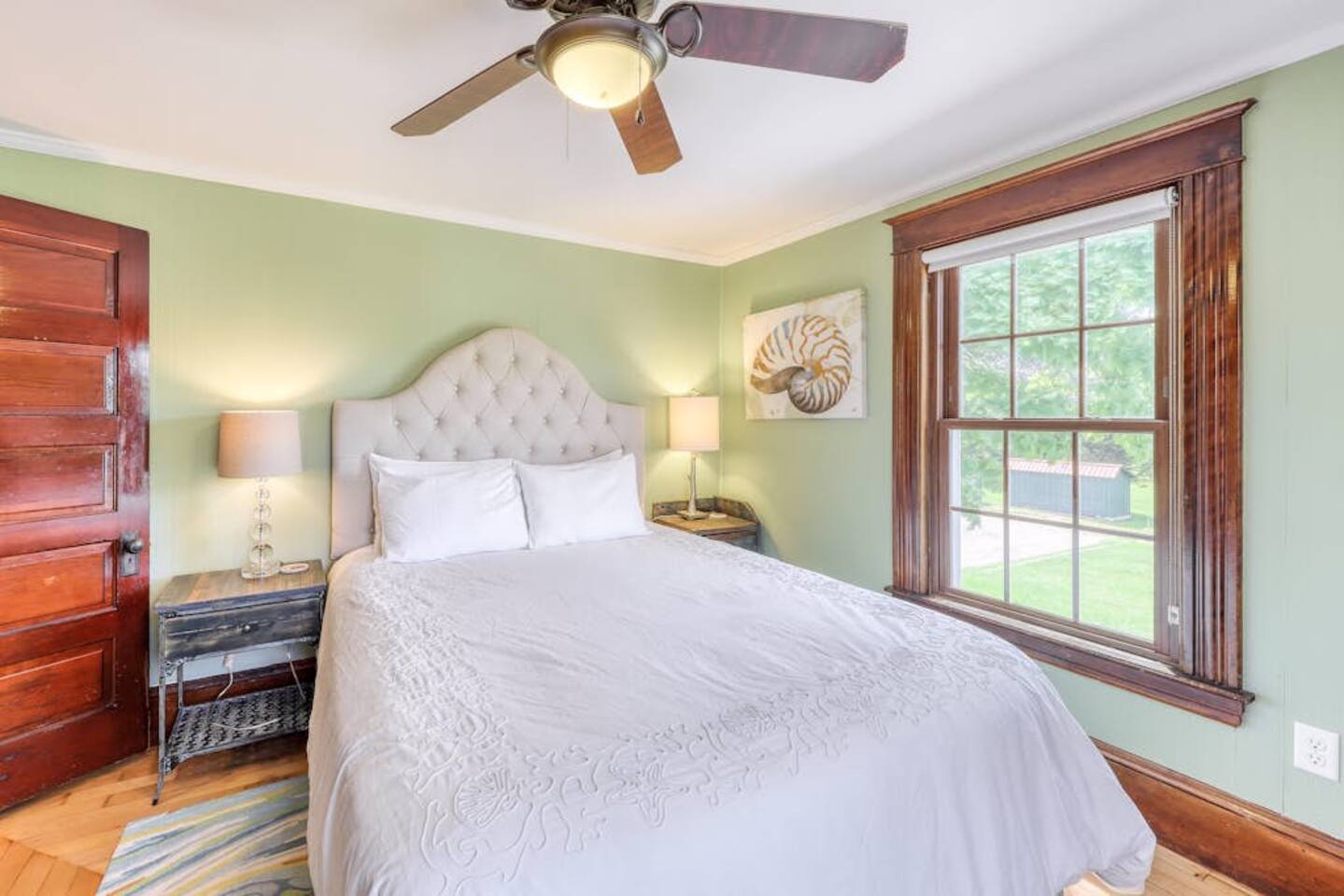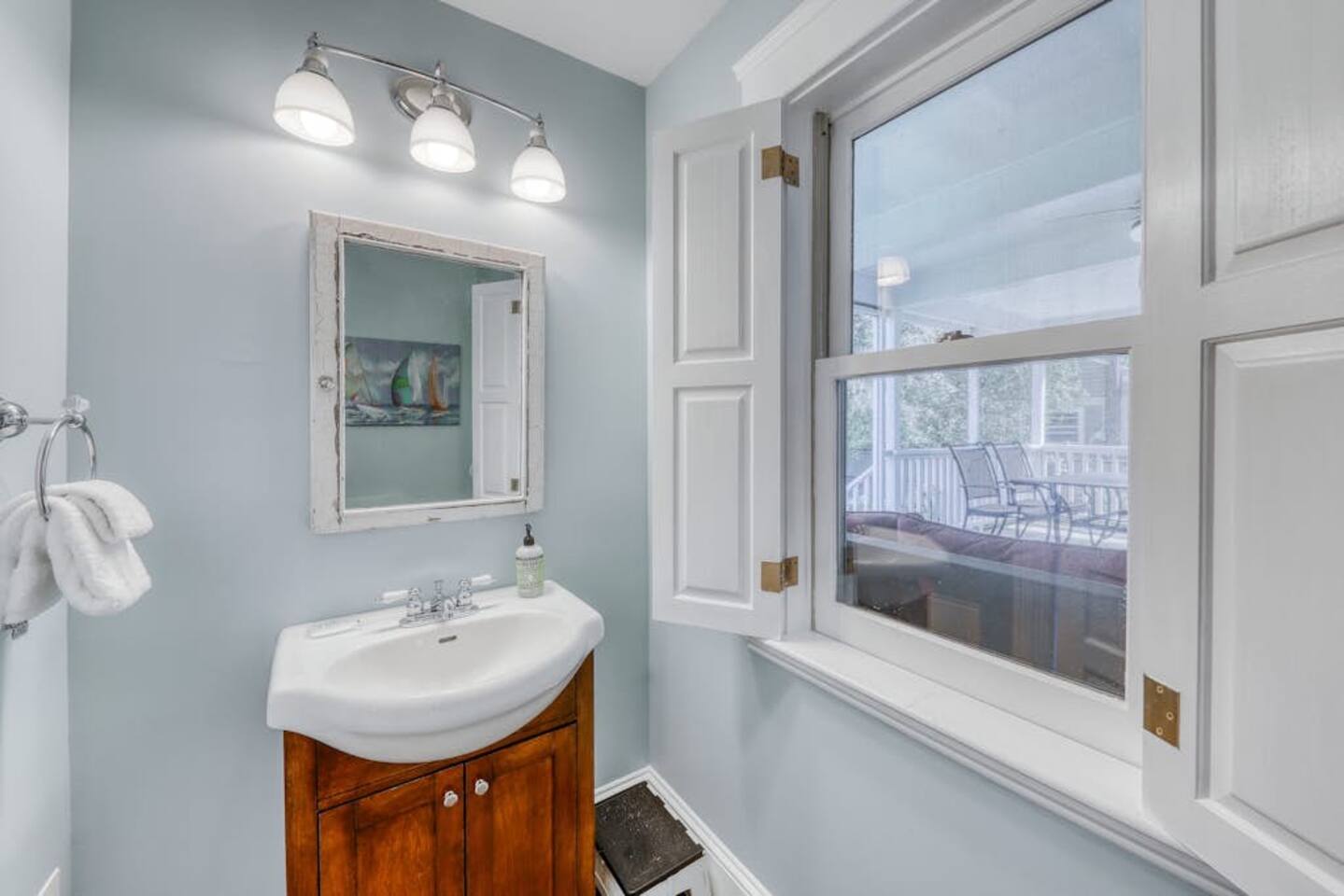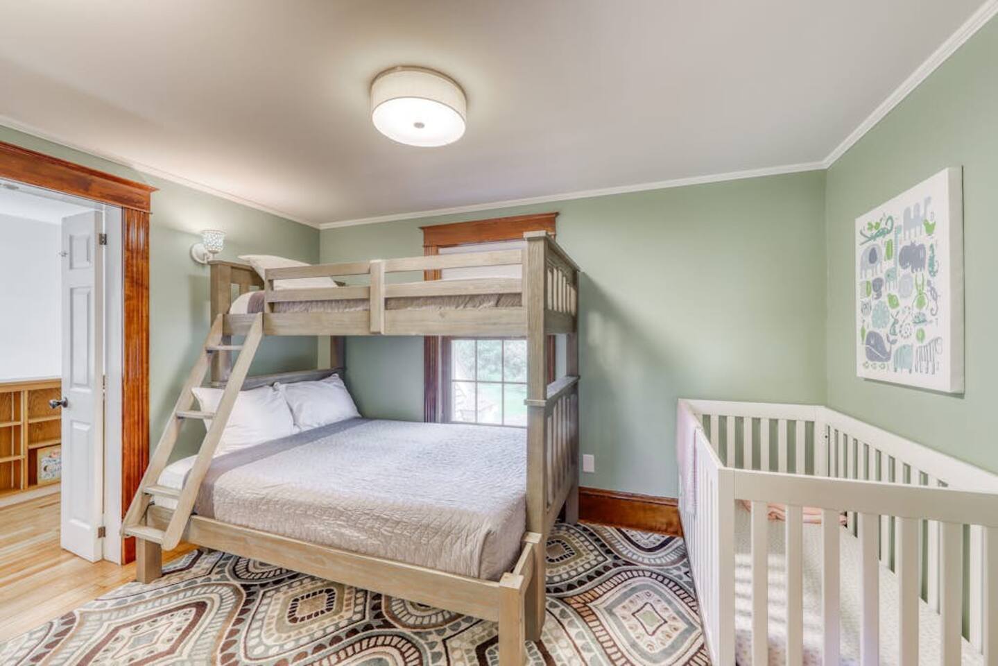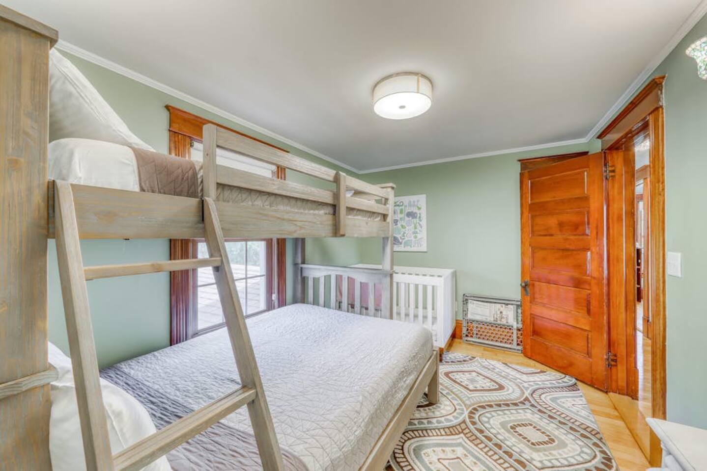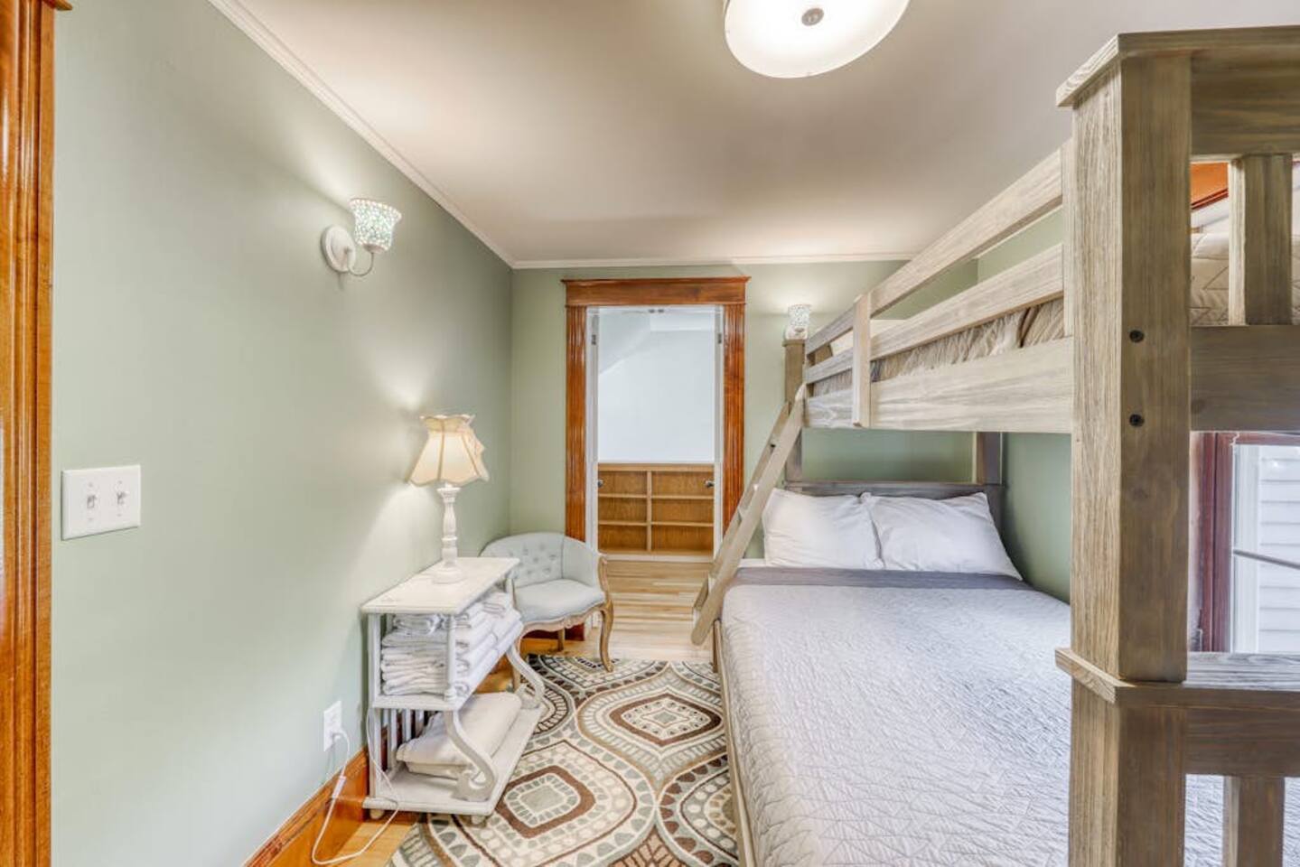 This three-bedroom, one-and-a-half-bathroom home will sleep as many as six people. There are two queen bedrooms upstairs, as well as a third bedroom with a crib, a rocking chair, and bunk beds with queen on the bottom, single up top. The full bathroom upstairs has a clawfoot tub and a stall shower.