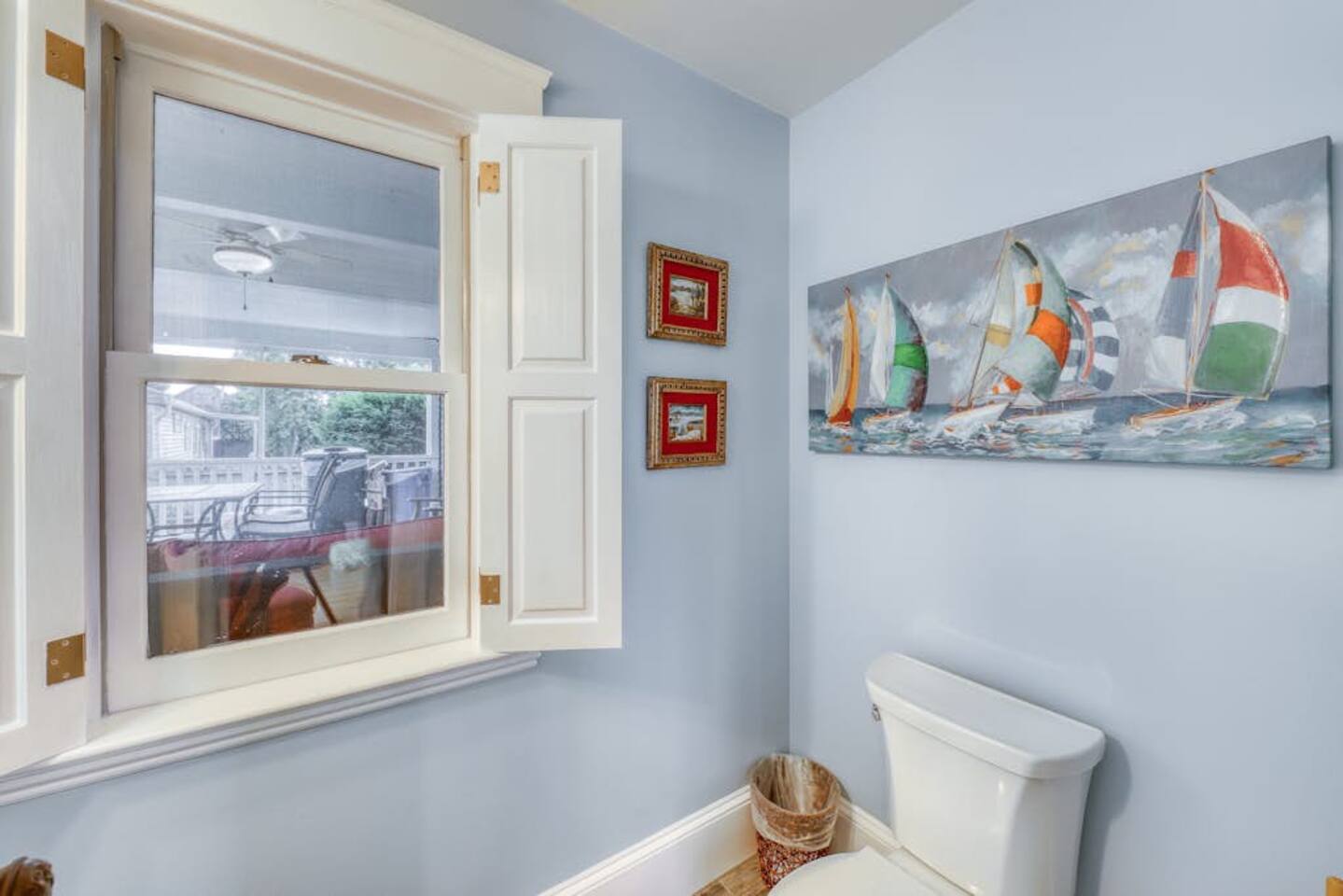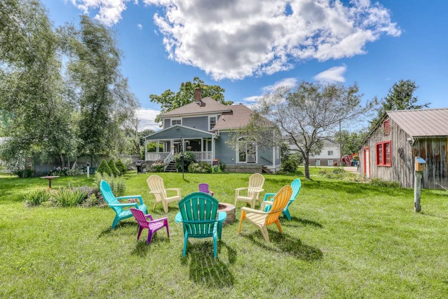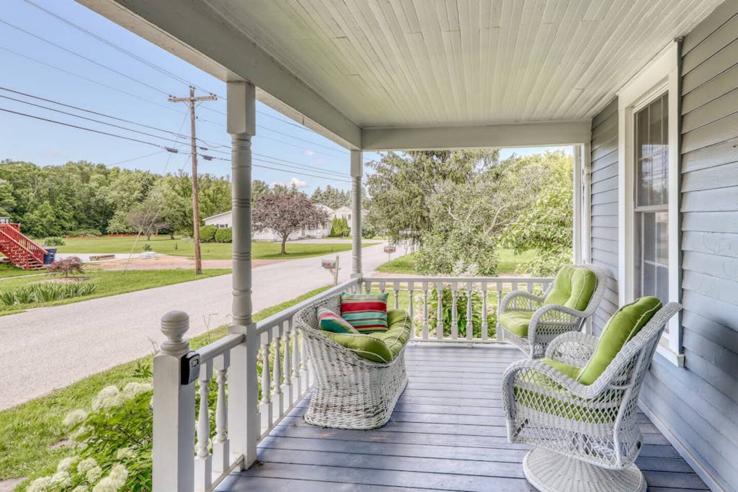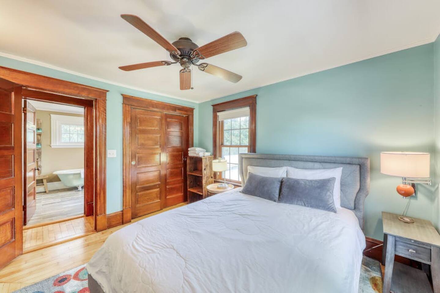 This three-bedroom, one-and-a-half-bathroom home will sleep as many as six people. There are two queen bedrooms upstairs, as well as a third bedroom with a crib, a rocking chair, and bunk beds with queen on the bottom, single up top. The full bathroom upstairs has a clawfoot tub and a stall shower.