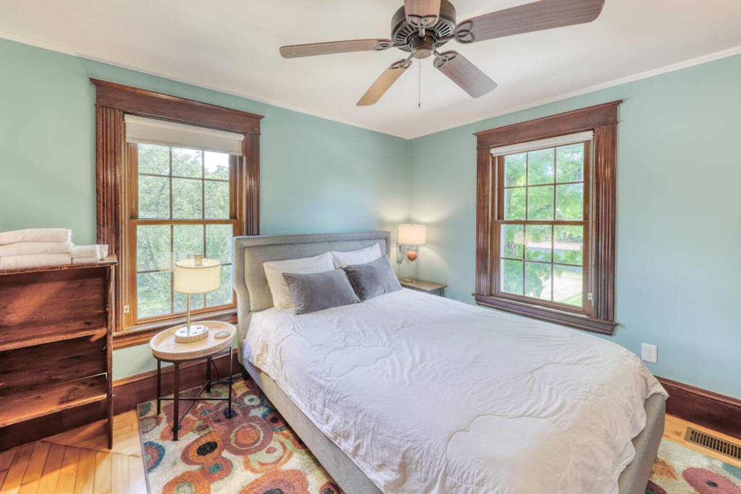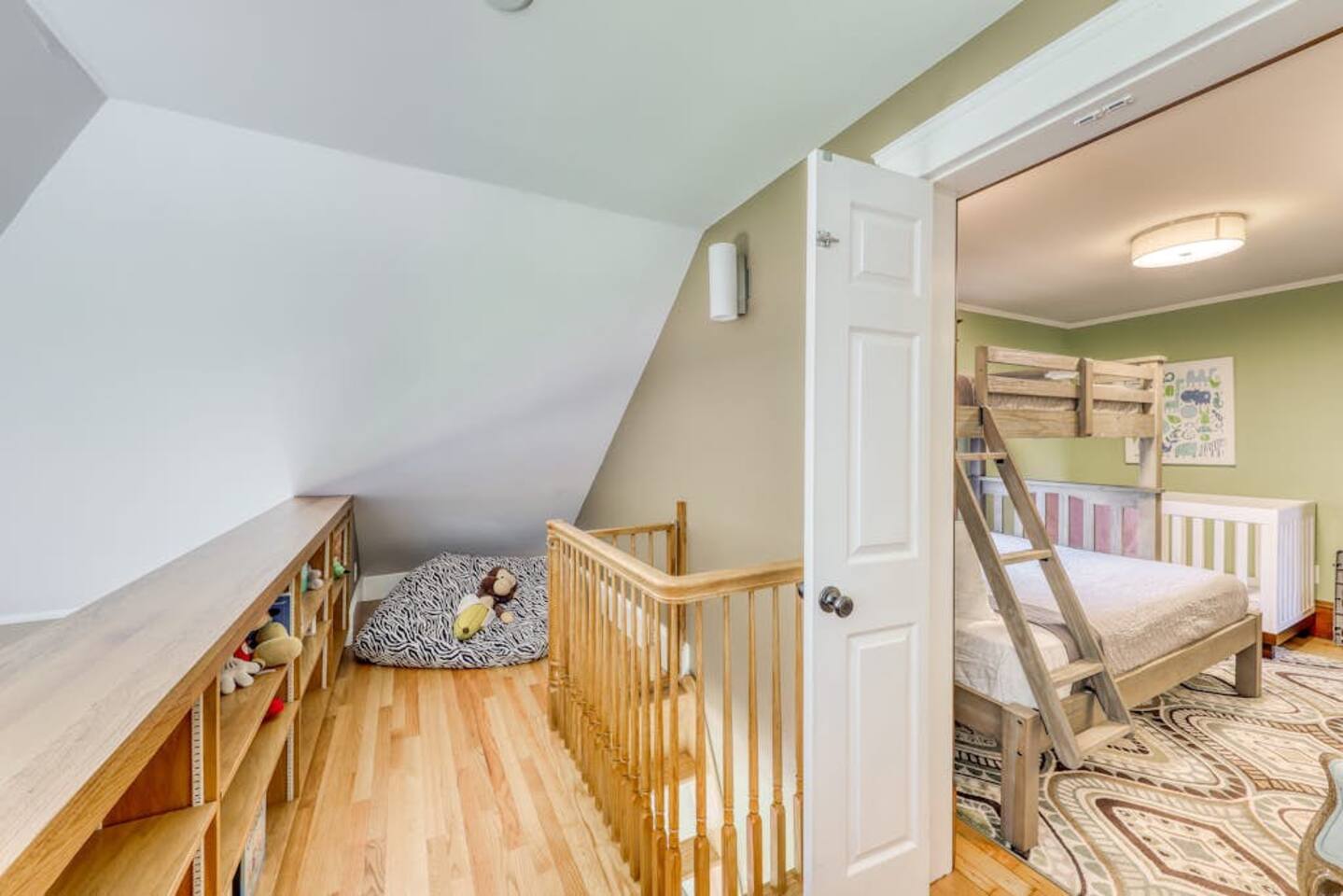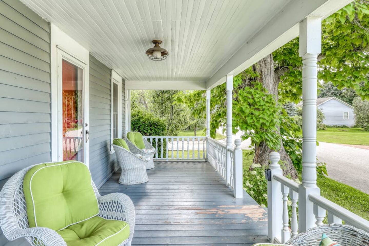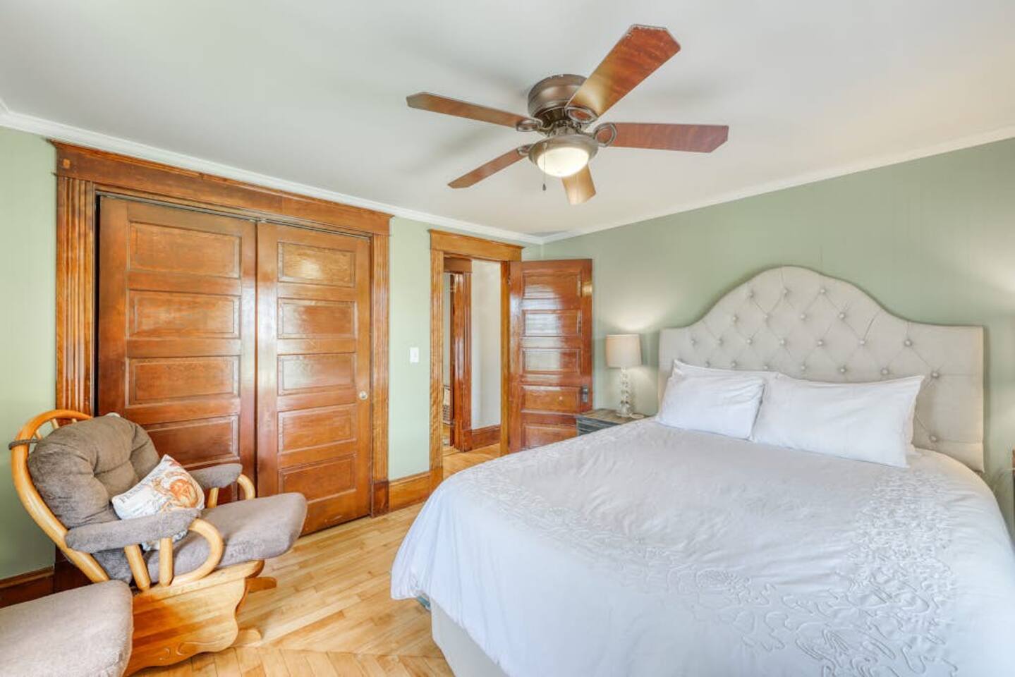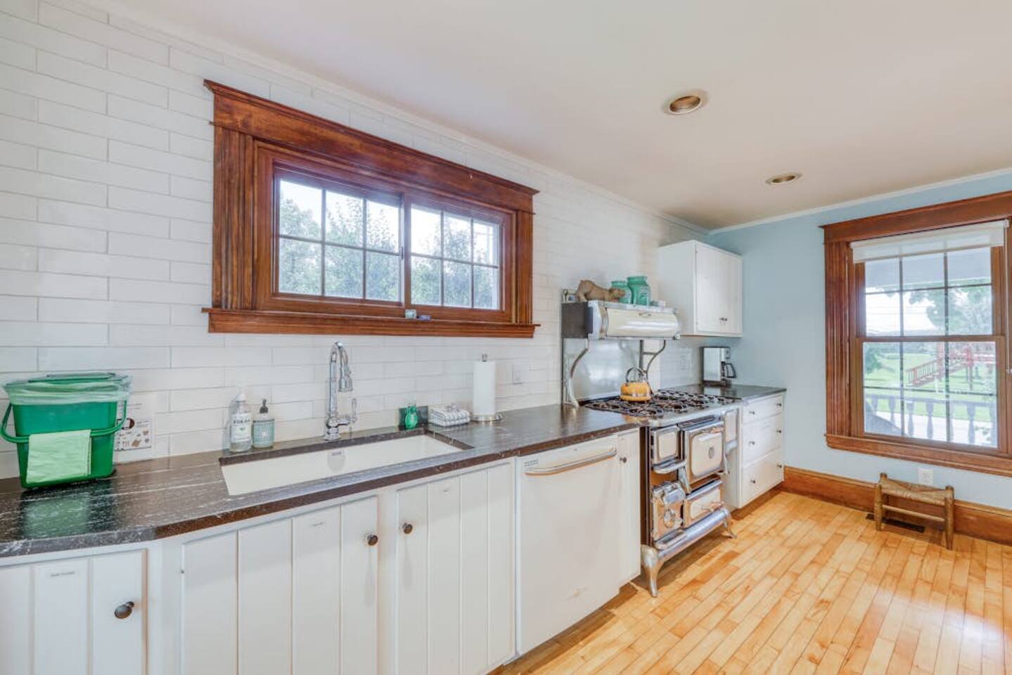 This three-bedroom, one-and-a-half-bathroom home will sleep as many as six people. There are two queen bedrooms upstairs, as well as a third bedroom with a crib, a rocking chair, and bunk beds with queen on the bottom, single up top. The full bathroom upstairs has a clawfoot tub and a stall shower.