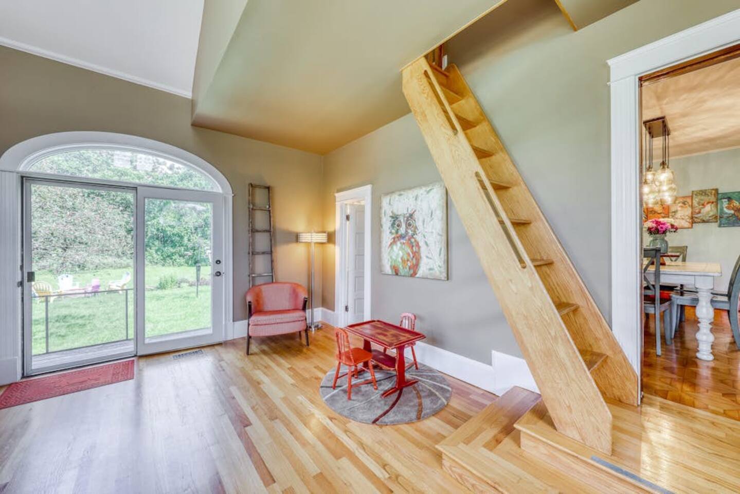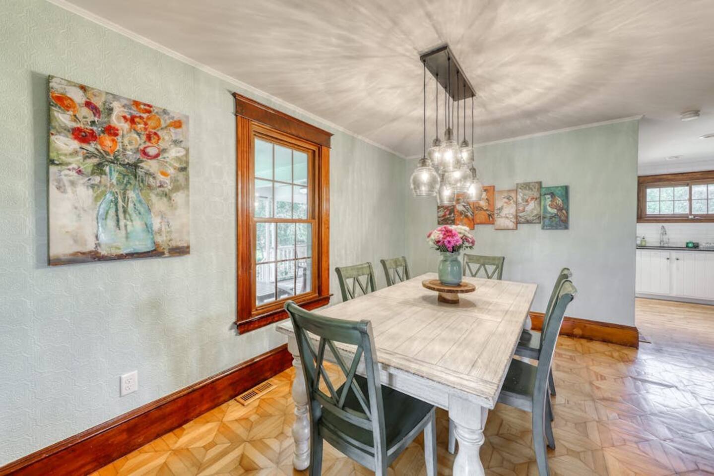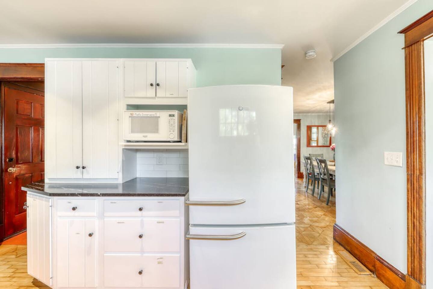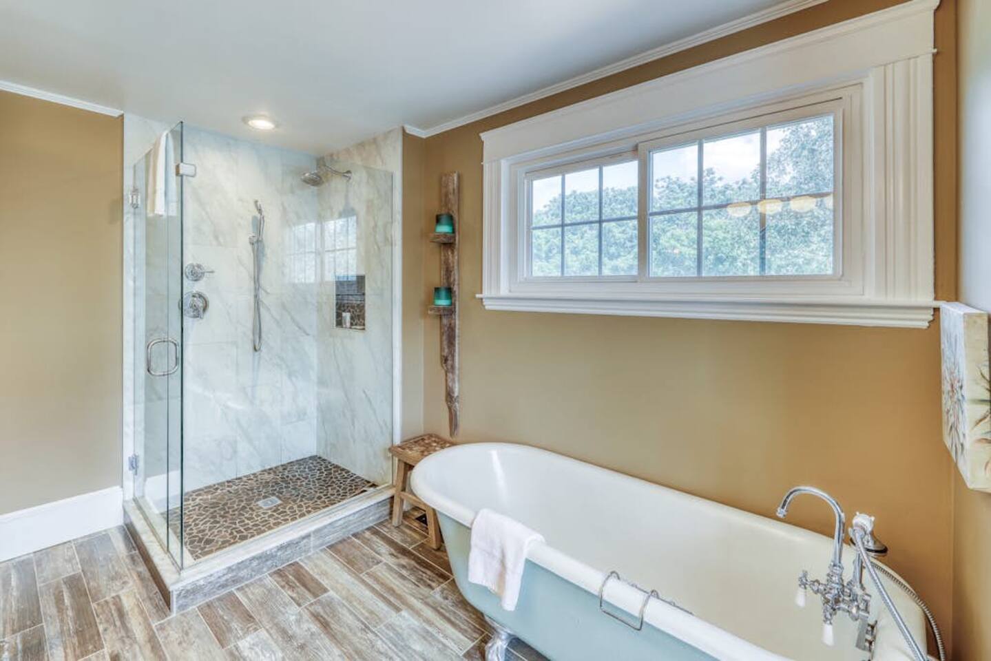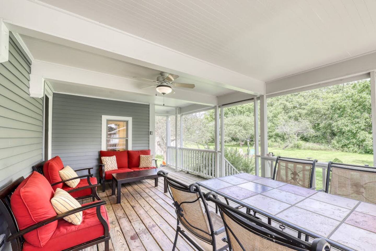 This three-bedroom, one-and-a-half-bathroom home will sleep as many as six people. There are two queen bedrooms upstairs, as well as a third bedroom with a crib, a rocking chair, and bunk beds with queen on the bottom, single up top. The full bathroom upstairs has a clawfoot tub and a stall shower.